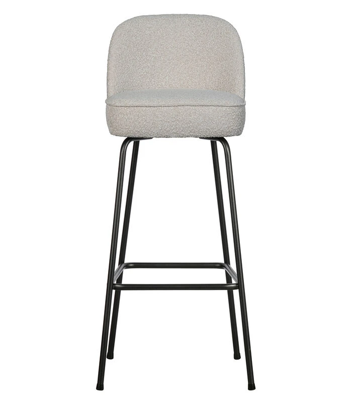 Het materiaal van de Colmar bouclé stof speelt in op de laatste trend: zachte materialen. De stof is comfortabel en heeft een elegante textuur. Onze Colmar bouclé heeft een Martindale van 100.000, dat betekent dat de stof geschikt is voor intensief gebruik. De dichte weeftechniek zorgt voor de sterkte van de stof, dit maakt dat de bouclé niet snel zal slijten of scheuren. Ook heeft elke kleur een hoge kleurvastheid, maar het is aangeraden om direct zonlicht te vermijden om kleurnuances te voorkomen. Het onderstel van de Vogue barstoel is gemaakt van metaal met een matzwarte poedercoating. Het frame van de zitting is opgebouwd uit een combinatie van spaanplaat en multiplex. De zitting bevat elastische riemen en een T3542 foam wat zorgt voor een iets stevig zitcomfort wat urenlang een comfortabele zitplaats verzorgt. De rugleuning is gevuld met een T2120 foam.
