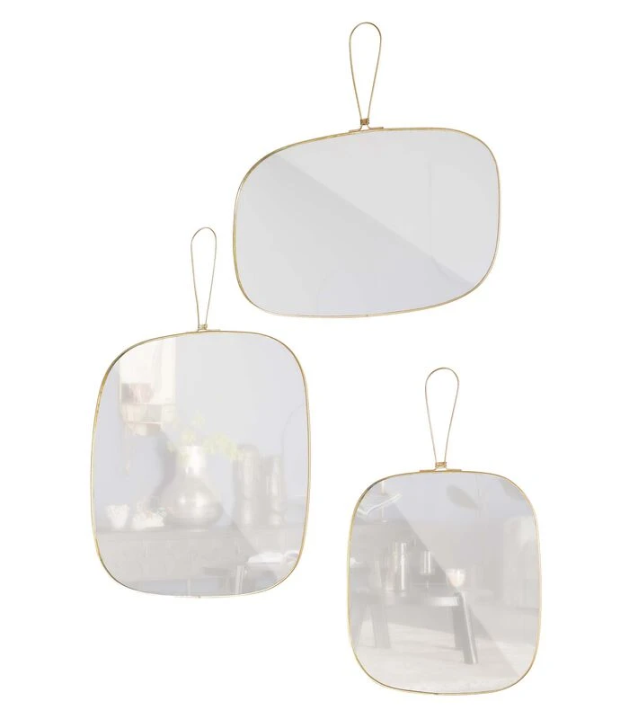 Deze speelse spiegelset komt uit de collectie van het Nederlandse merk BePureHome. Spiegelset Glass bestaat uit drie ludieke spiegels met elk een speelse afgeronde vorm. De drie spiegels hebben een antique brass kleurig frame en een royale lus waaraan ze opgehangen kunnen worden.