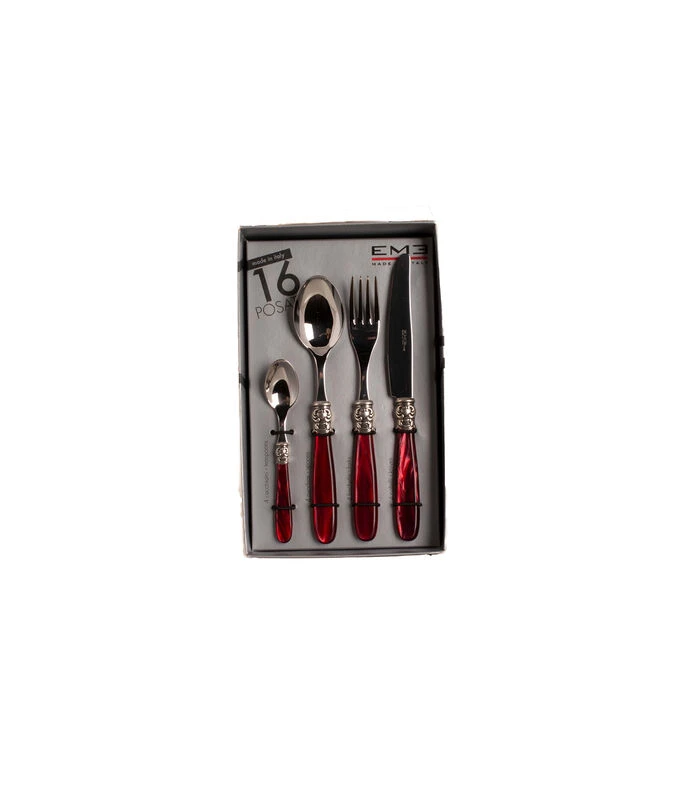 Deze EME Mona Lisa bestekset is ontwikkeld voor de liefhebber van bestek van Italiaanse hoogwaardige kwaliteit en een eigentijdse afwerking. Traditioneel en modern is in deze bestekset samen gebracht, waarbij het bestek licht in gewicht is. Deze serie kenmerkt zich door een uitstekende balans in dikte van het handvat en het lange, elegante lemmet. Deze prachtige 16–delige bestekset bestaat uit 4 tafelvorken, 4 tafelmessen, 4 tafellepels en 4 koffielepels. Ieder item is gemaakt 18/10 roestvrij staal en heeft een acryl bordeaux rood handvat.