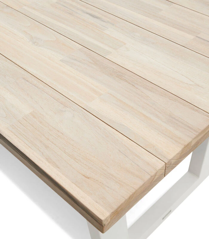 Een lange teakhouten tafel in de tuin waaraan iedereen kan aanschuiven voor die heerlijke zomerse maaltijden die uren mogen duren. Familie, vrienden, schuif maar aan en eet maar mee. Handgemaakt door ambachtslieden die vol passie met het hout bezig zijn. Met poten van staal, dat staat stevig. De tafel kunt u met een droge borstel schoonmaken. Vlekken mag u met een vochtige doek weghalen.