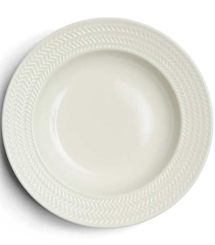 Het saladebord uit de RM Bellecôte serviesserie staat leuk op de feestelijk gedekte tafel. Dat komt onder andere door de sierrand in visgraatpatroon. Het geeft ook aan dat er naar keuze salade kan worden gegeten, of een ander bijgerecht.
