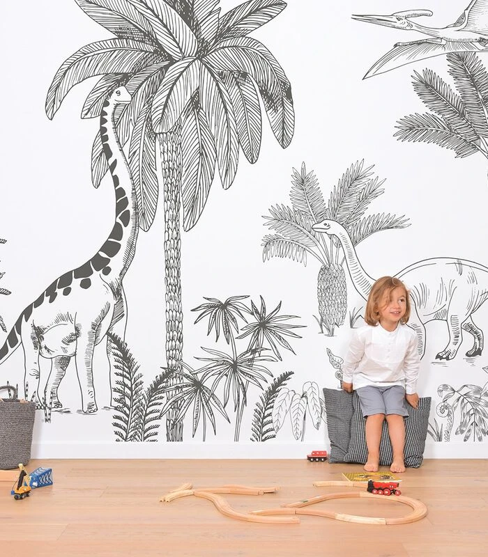 Behang, een mooie manier om de kinderkamer om te toveren. Door de mooie zwart met witte afbeelding is het behang vrij rustig en tijdloos.