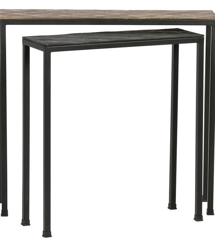Deze set van 2 Lane bijzettafels uit de collectie van het Nederlandse merk WOOOD Exclusive hebben een sierlijk en elegante uitstraling door het pauwenoog patroon in het tafelblad. De bijzettafels hebben beide een aluminium blad, één met een antique brass afwerking en de andere met een zwarte afwerking. De onderstellen zijn gemaakt van ijzer met een zwarte afwerking.