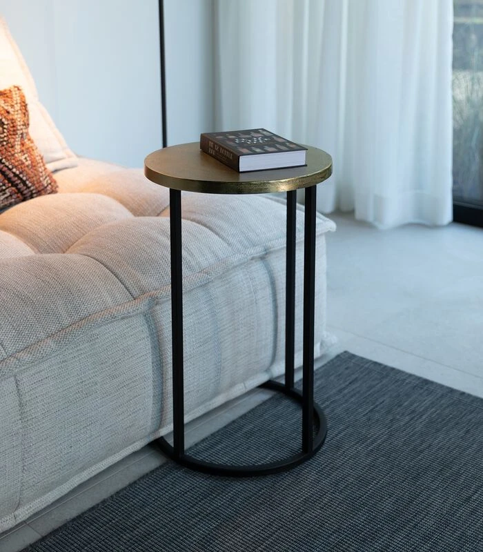 De tijd dat je een bijzettafeltje alleen naast de zetel kon zetten is voorbij… Neem nu het bijzettafeltje Fitz: het moderne design met zwart metalen frame en tafelblad in raw antique brass is tijdloos en kan je integreren in élke ruimte. Als nachttafeltje op de slaapkamer, naast de zetel of je lievelingsstoel of gewoon in een hoek van de kamer met een mooie plant of een aantal van je mooiste spulletjes erop. Zoekwoorden : Woonkamertafel, Koffietafel, Bijzettafel, metaal, rond, Modern, industrieel