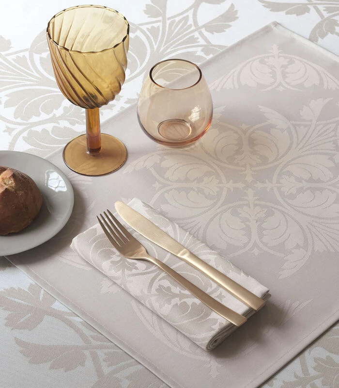 De charme van Sicilië wordt onthuld met Syracuse, een eerbetoon aan de Italiaanse levenskunst. Zachte, zuivere barokmotieven versieren dit tafelkleed met drie strepen in een beige gradatie.