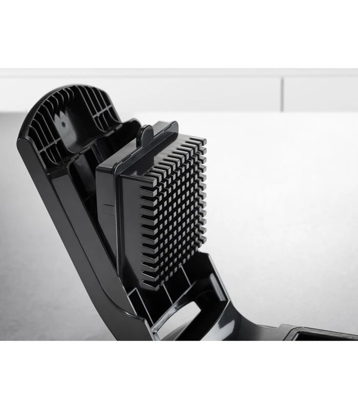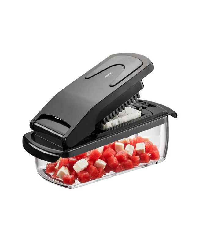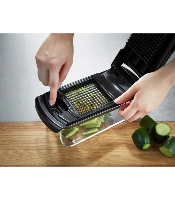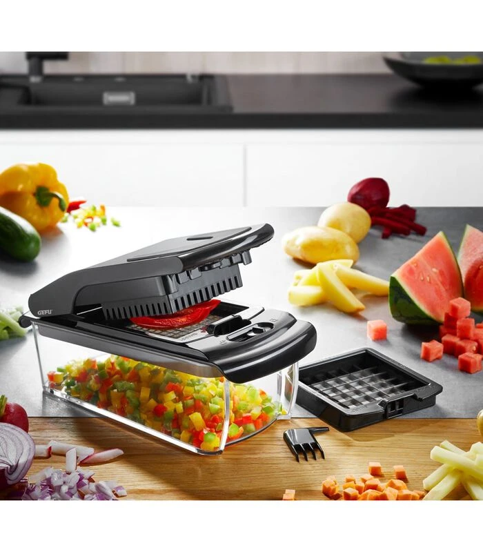 Sneller en comfortabeler kan men groente en fruit niet in gevarieerde blokjes en veelzijdig bruikbare reepjes omtoveren. Extra scherpe meselementen zorgen voor moeiteloos snijden en gelijkmatige resultaten – van fijn voor gezonde rauwkost of vaste soepingrediënten tot grof voor frietjes of lekkere eenpansgerechten. Perfect ook om feta in blokjes te snijden.