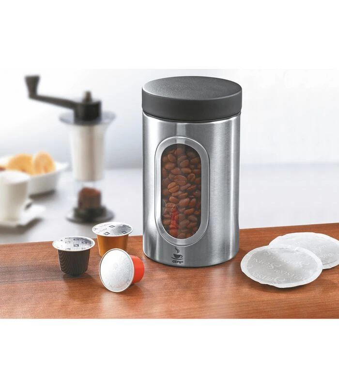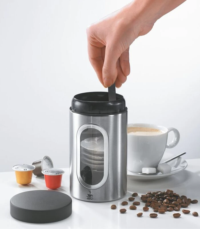 De perfecte bewaarplaats voor capsules of pads: de roestvrij stalen koffi epad bewaardoos PIERO met kliksluiting. Zo blijft het koffi earoma behouden.