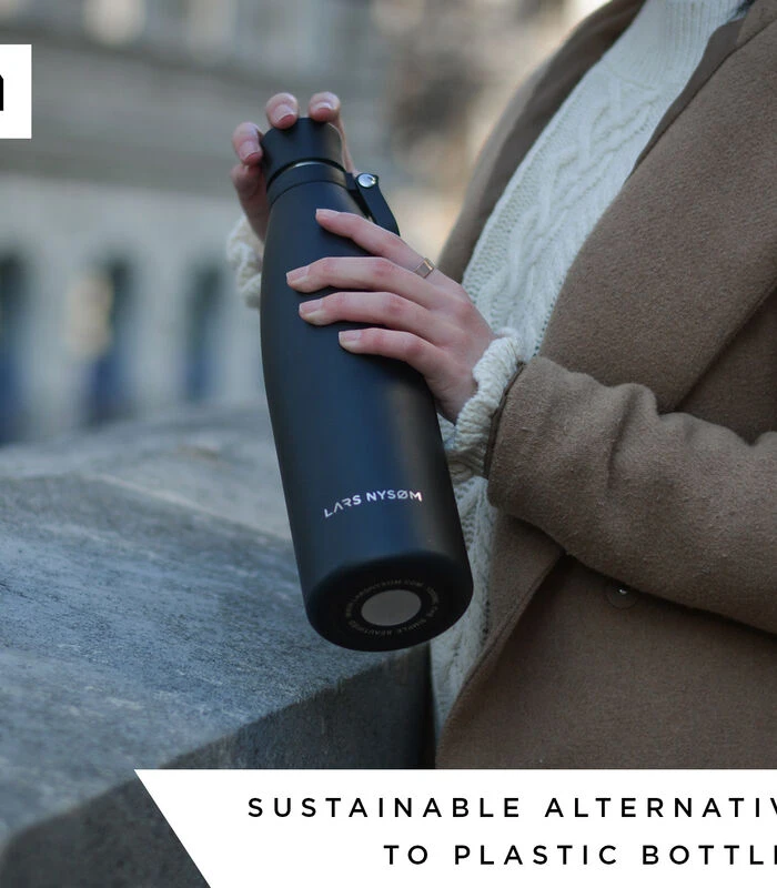 De roestvrijstalen drinkfles van LARS NYSØM is het duurzame alternatief voor plastic flessen. Hoogte: 30,5 cm, Ø 8,2 cm, Inhoud: 1000 ml, Gewicht: 436 g. Perfect voor kantoor, yoga, fitness, kinderen, baby of auto.