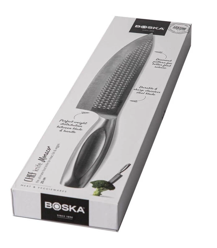 Een echte must have voor iedere keukenprins(es): het BOSKA Koksmes Monaco+. Geschikt voor het snijden van vlees, vis en groenten en het hakken van o.a. kruiden en kleine knoflooktenen. Door de slanke bolster heb je volledige controle over het roestvrijsta