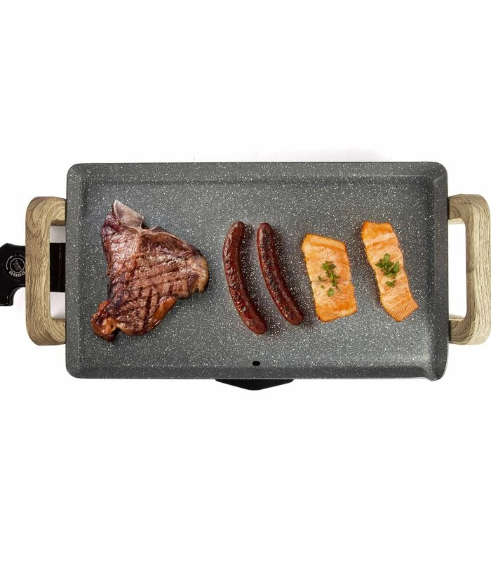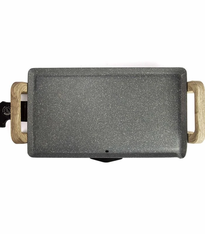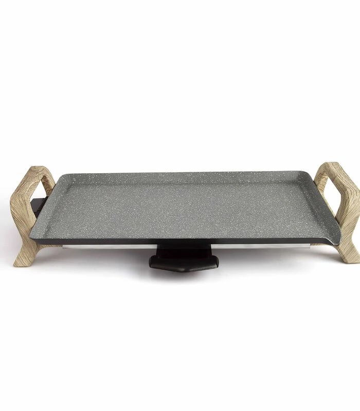 Bakplaat. Zware aluminiumplaat gegoten. Anti–aanbaklaag met steenlook. Handgreep met houten uitstraling. Kookoppervlak 46 x 26cm. Verwijderbare en regelbare thermostaat. Vetlekbakje. 4 antislipvoeten.