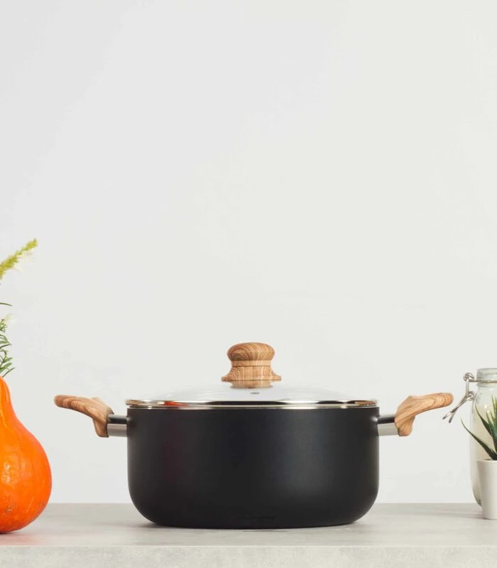 Antikleefbekleding met steen– en houtlook. Diameter 28 cm. Capaciteit 6 l. Houten uiterlijk met handvat gecoat met siliconen. Geschikt voor alle soorten fornuizen inclusief inductie. Glazen deksel stoomklep.