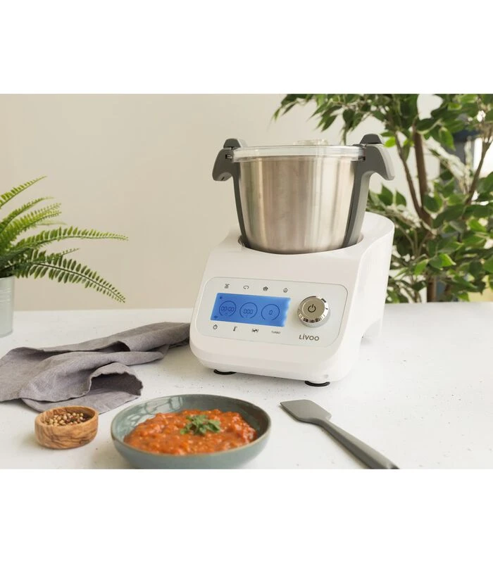 Vele functies: bakken, stomen, sudderen, het creëren van sauzen, hakken, kloppen, malen, emulgeren, kneden, mengen/mixen, raspen, roeren Roestvrijstalen kom van 3,5 L met deksel en maximale inhoud van 2,3L Handmatige programmering van temperatuur, kooktijd en snelheid op LCD–scherm Geïntegreerde weegschaal4 roestvrijstalen messen Instelbare timer van 1 tot 90 minuten12 vermogensniveaus zoals pulsfunctie Nauwkeurige en constante temperatuur van 37° tot 120°C met een stap van 5°C Meegeleverde accessoires: vlinderklopper, 2 stoombakken met deksel, 1 binnenmand, 1 spatel, 1 roerlepel, 1 omkeerbaar schijfblad, 1 doorzichtige blender deksel, 1 doorzichtige keukenmachine deksel, 1 stamper, kookboek