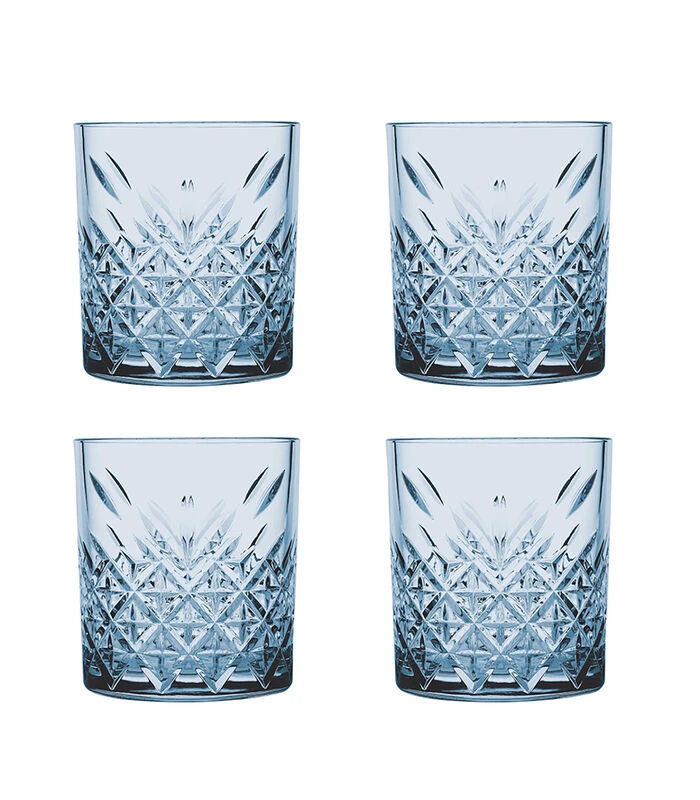 Deze opvallende waterglazen met chique gouden rand uit de serie Timeless hebben een prachtig rechte vorm, waardoor ze fijn in de hand liggen. Met hun bijzondere hoekige glasbewerking maken zij iedere frisdrank of cocktail tot een ware traktatie. De glazen hebben een dikke bodem, wat ze een robuust en stoer karakter geeft. Daarnaast zijn deze glazen gemaakt van extreem sterk glas en kunnen na gebruik perfect gereinigd worden in de vaatwasmachine. Met deze waterglazen heb je voor ieder moment op de dag de juiste glazen in huis. Deze set bestaat uit 4 blauwe waterglazen met een inhoudsmaat van 35,5 cl.