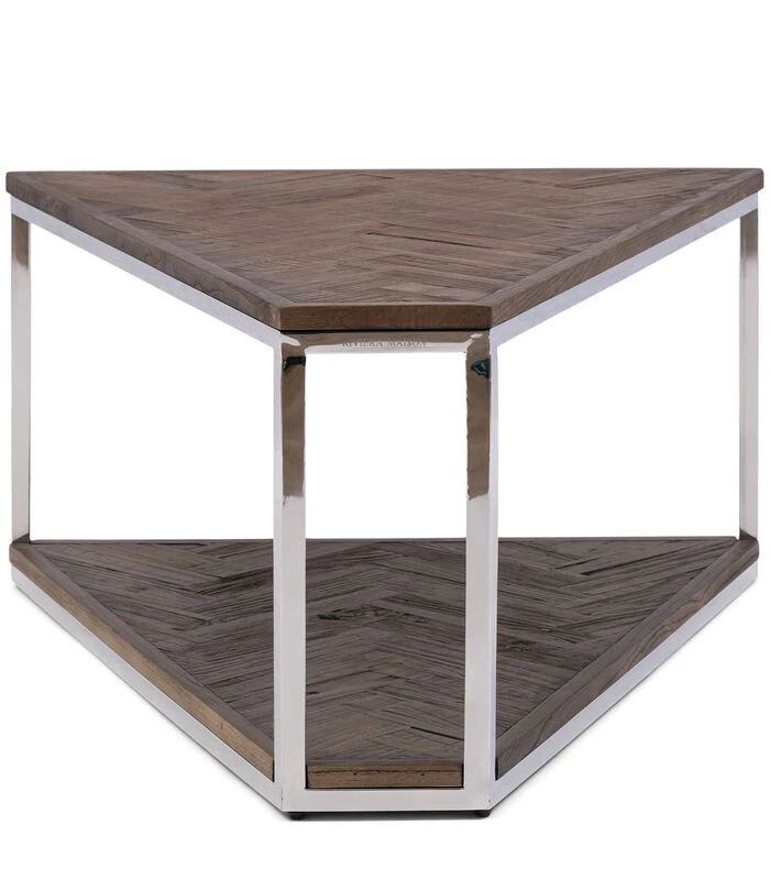 De Bushwick Triangle salontafel is een te gekke salontafel met een bijzondere vorm. De tafel is van oud iepenhout dat met een visgraatpatroon is ingelegd in een frame van glanzend roestvrij staal. Doordat de salontafel taps toeloopt, valt hij geweldig te combineren met andere meubelstukken, zoals bijvoorbeeld tussen twee delen van een modulebank.