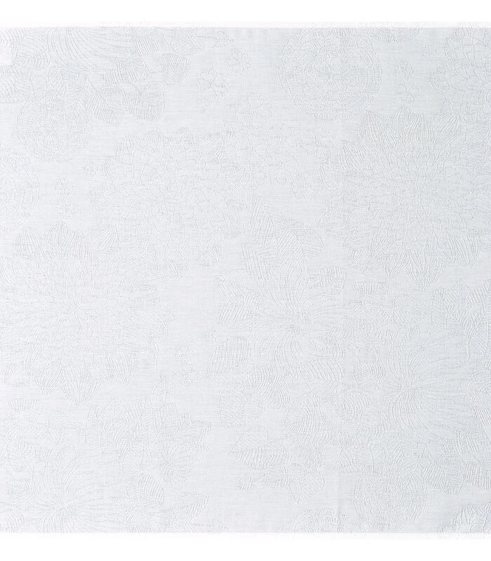 Welkom op de Marie Galante archipel in de Caribische Zee. De overvloed aan dahlia, kamperfoelie, zinnia en kleine geraniumbloemen in reliëf doet denken aan de geur van vakantie in een delicate toon op toon.