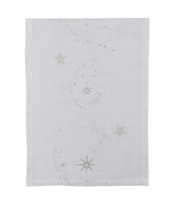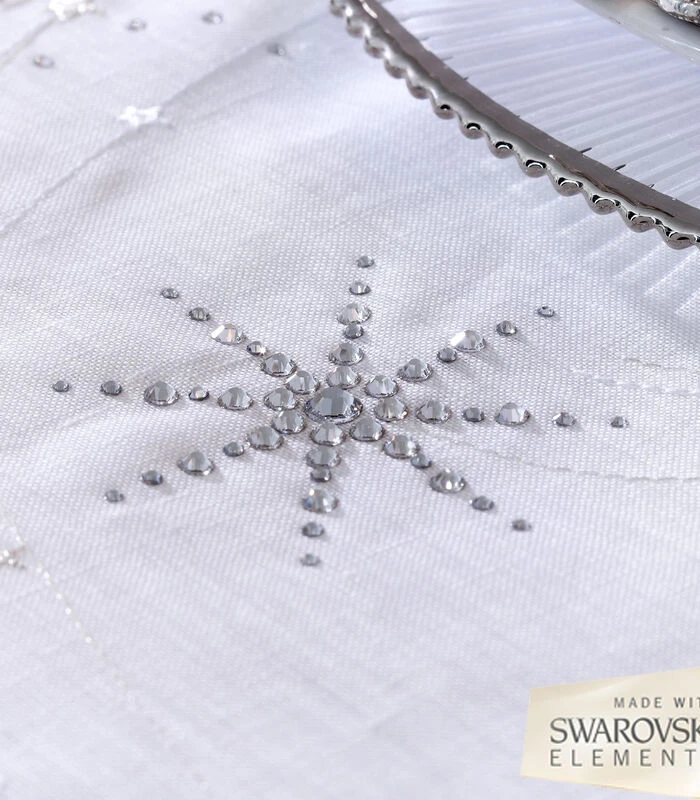 Model Stella is een effen linnen tafellaken, waarop kometenmotieven zijn geborduurd. Het is eveneens versierd met Swarovski®–kristallen.