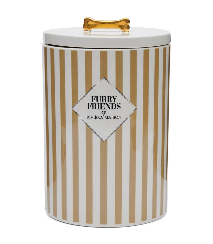 Bewaar de hondensnoepjes of brokjes van jouw lieve hond in deze handige voorraadpot. De gestreepte voorraadpot heeft een gouden hondenbrokje als leuk detail op de deksel. Deze voorraadpot is leuk te combineren met de voederbakken voor de hond.