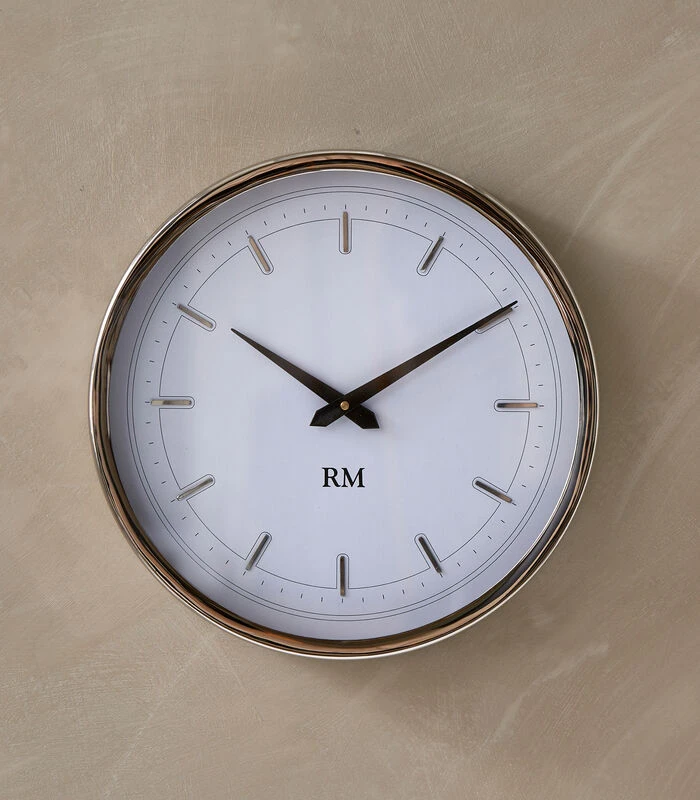 De RM Yara Clock is een ronde wandklok met een zilverkleurige, metalen rand. De uren staan aangegeven met zilverkleurige streepjes. De wijzers zijn zwart, net als de subtiele tekst ‘RM’. Het enige goudkleurige detail is het bevestigingsknopje voor de wijzers, in het midden van de klok.