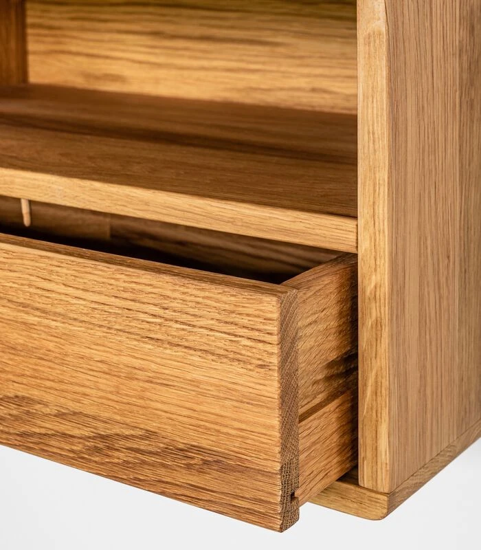 Een modern zwevend nachtkastje met een open opbergruimte en een lade is een geweldige oplossing voor de meeste slaapkamers. Functionele lade om uw spullen op te bergen en binnen handbereik te houden Open plank om uw favoriete boeken op te zetten en extra opbergruimte te hebben. Dit product is gemaakt van massief Europees eikenhout. Met de schoonheid van de natuurlijke nerf van het hout. Dit product is gemaakt van natuurlijk massief eikenhout, elk stuk is uniek qua kleur, natuurlijke kenmerken, nerfpatronen en afwerking. Het is dus mogelijk dat u enkele verschillen tussen artikelen van eenzelfde productlijn ziet; dit is onderdeel van de natuurlijke schoonheid van onze producten. Voor het binnenmateriaal van het product kunnen andere soorten hardhout worden gebruikt.